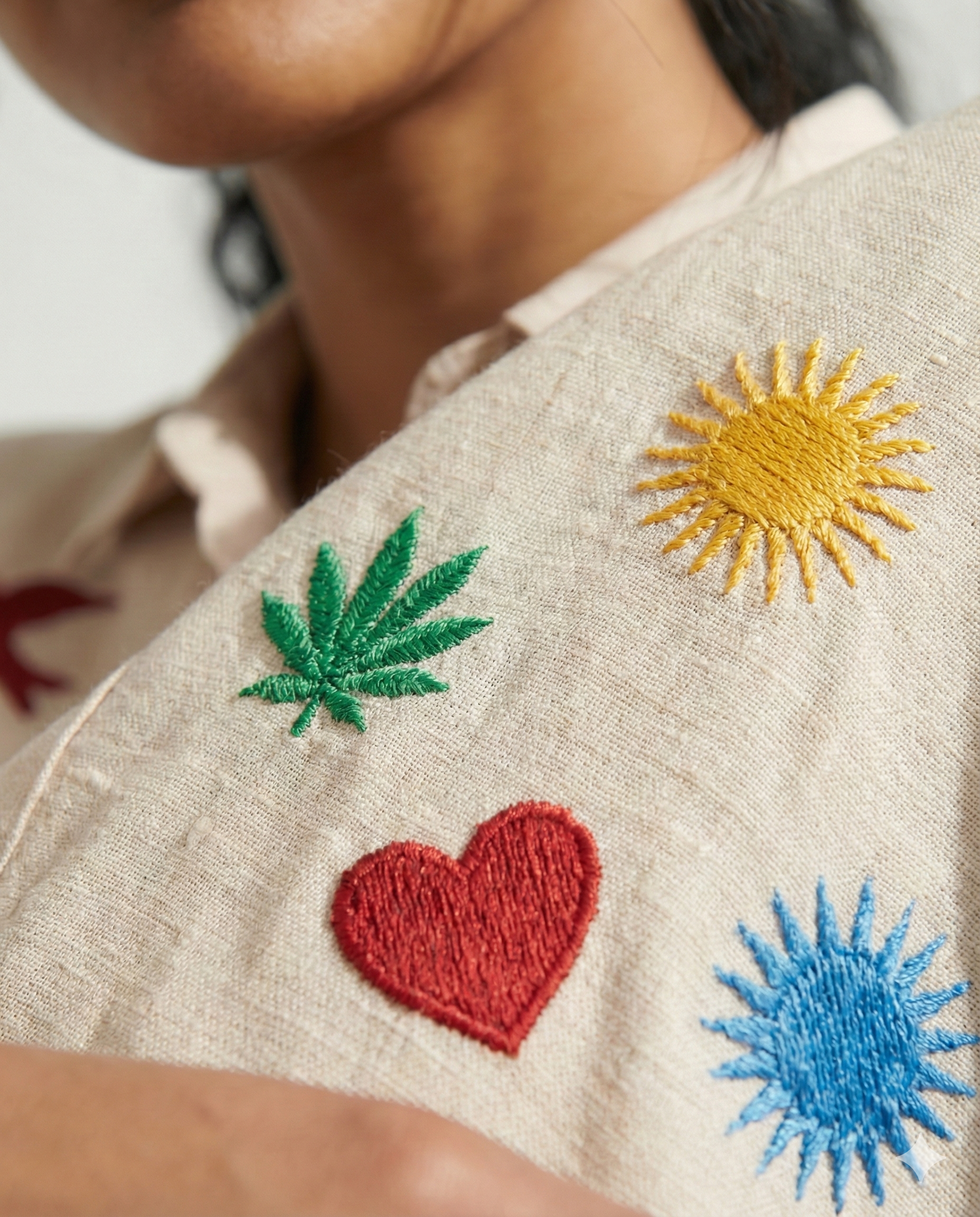 This relaxed button-down shirt is crafted from breathable beige linen. It features playful, colorful embroidery of hearts, cosmic symbols, and nature motifs scattered across the front and sleeves, offering a whimsical twist on a classic essential.