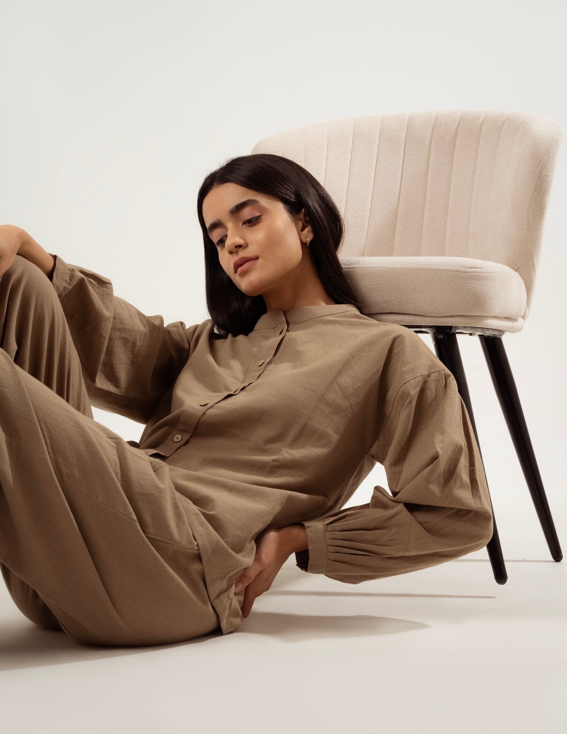 Made with premium organic fabric, this taupe shirt features a clean mandarin collar, a full button-down front, and softly gathered sleeves. A relaxed yet refined staple for effortless, conscious dressing.