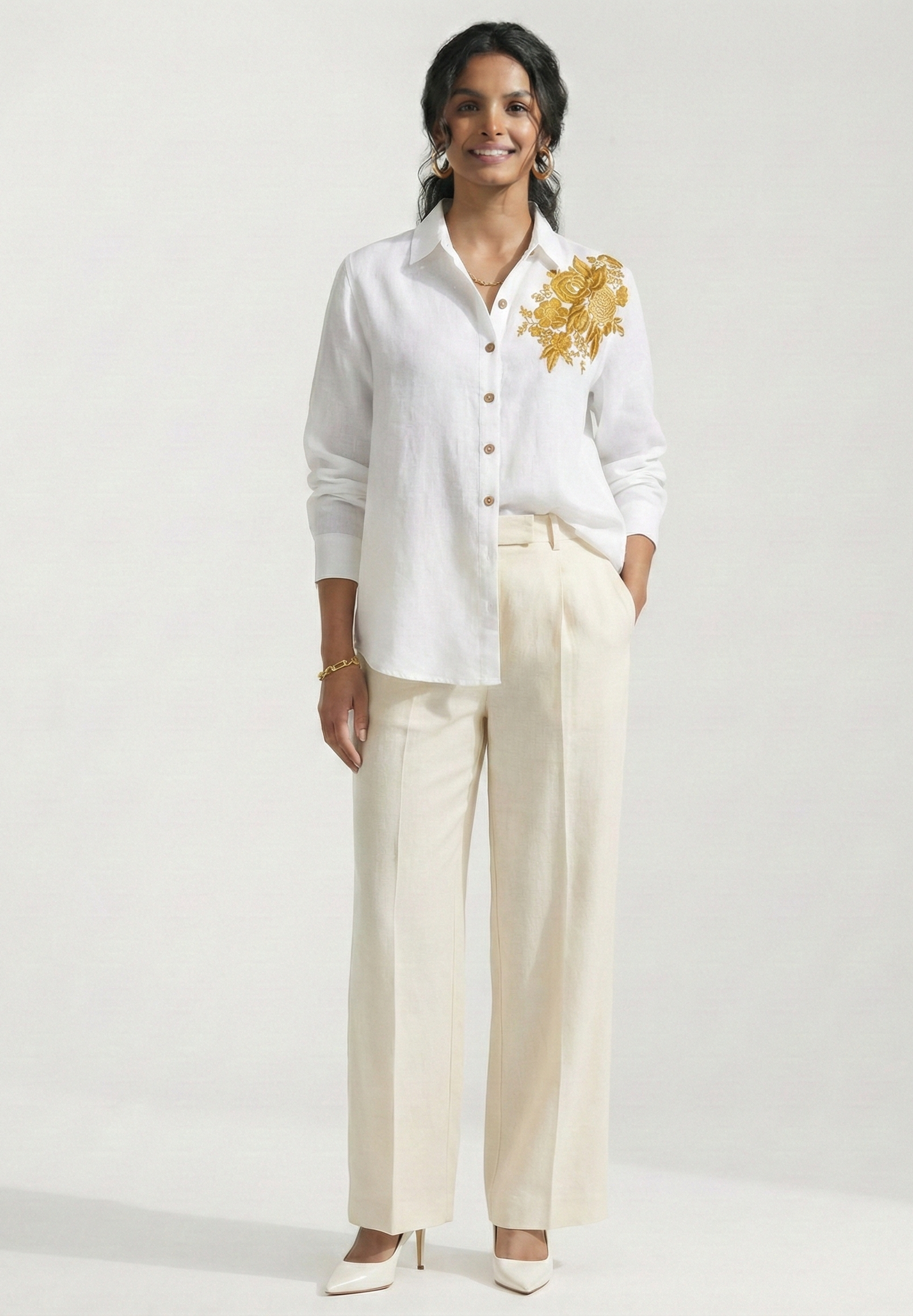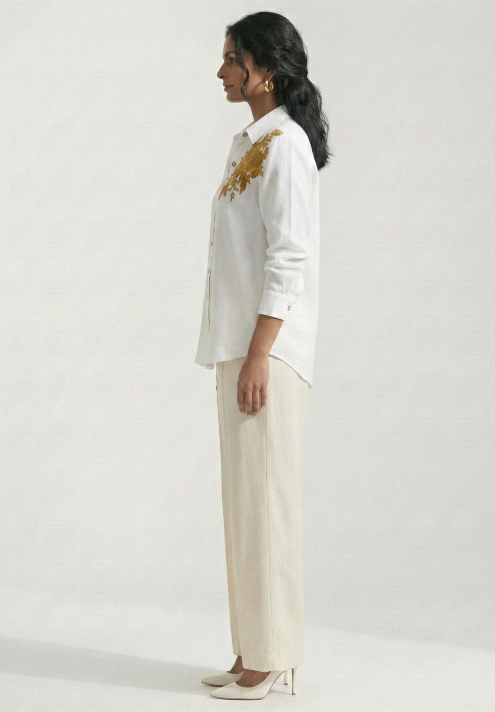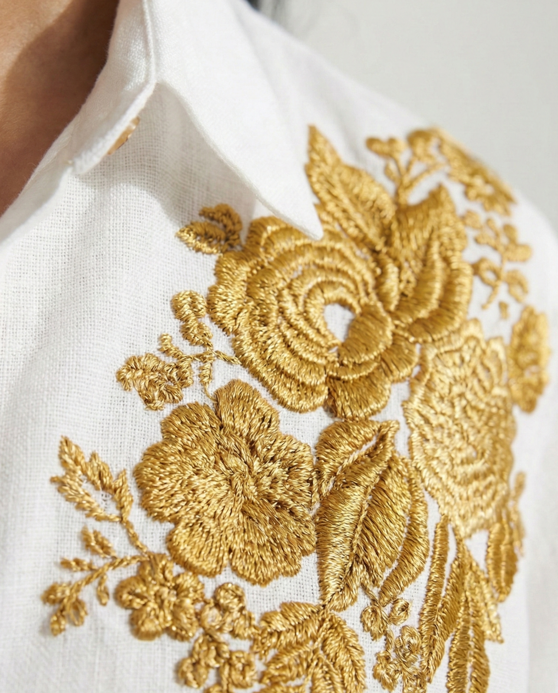 Drama meets elegance. This pure cotton linen shirt features a lavish cluster of Golden floral embroidery cascading over one shoulder against a sleek white canvas. Asymmetrical, bold, and beautifully crafted - a standout piece for those who love to make an entrance.