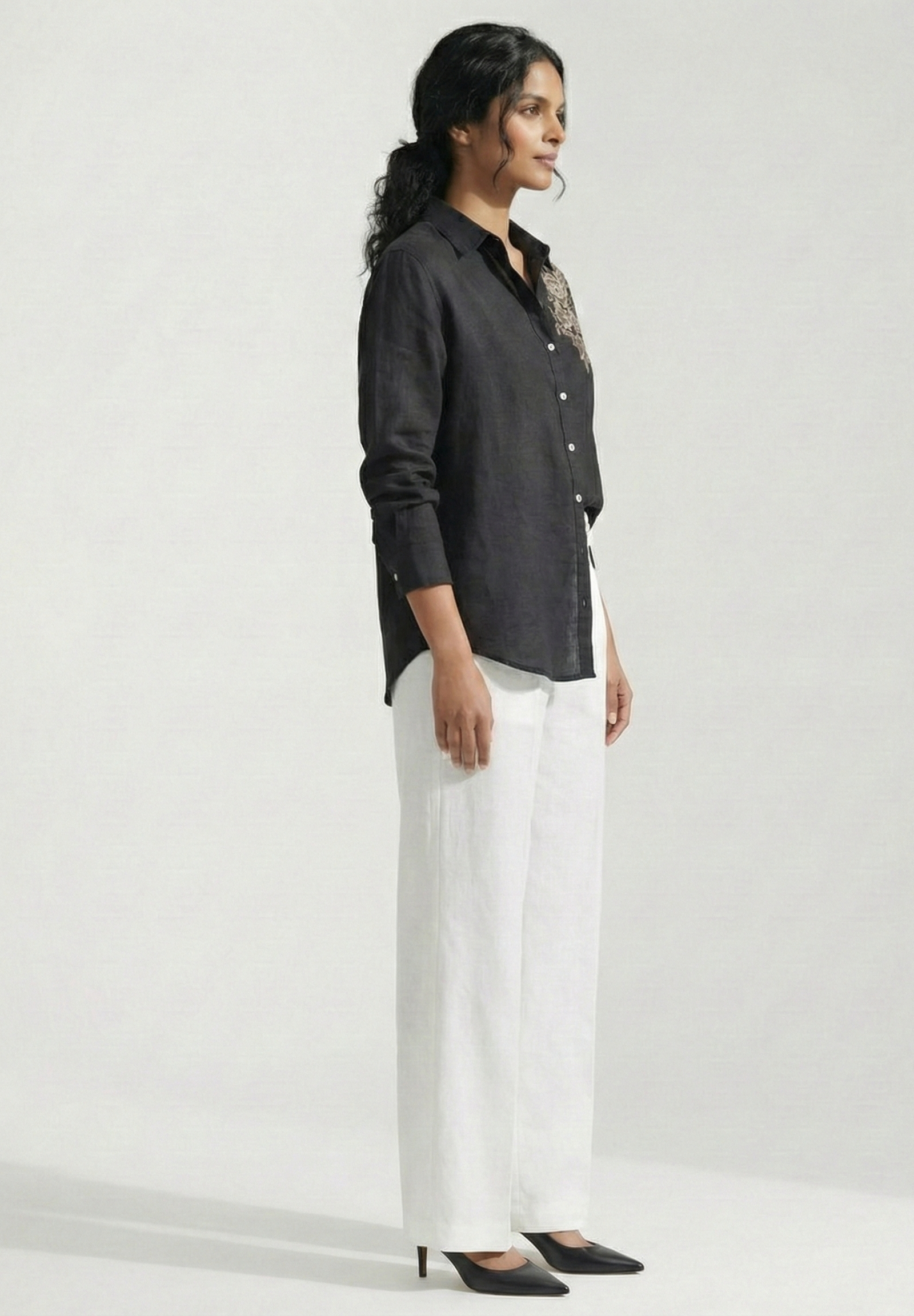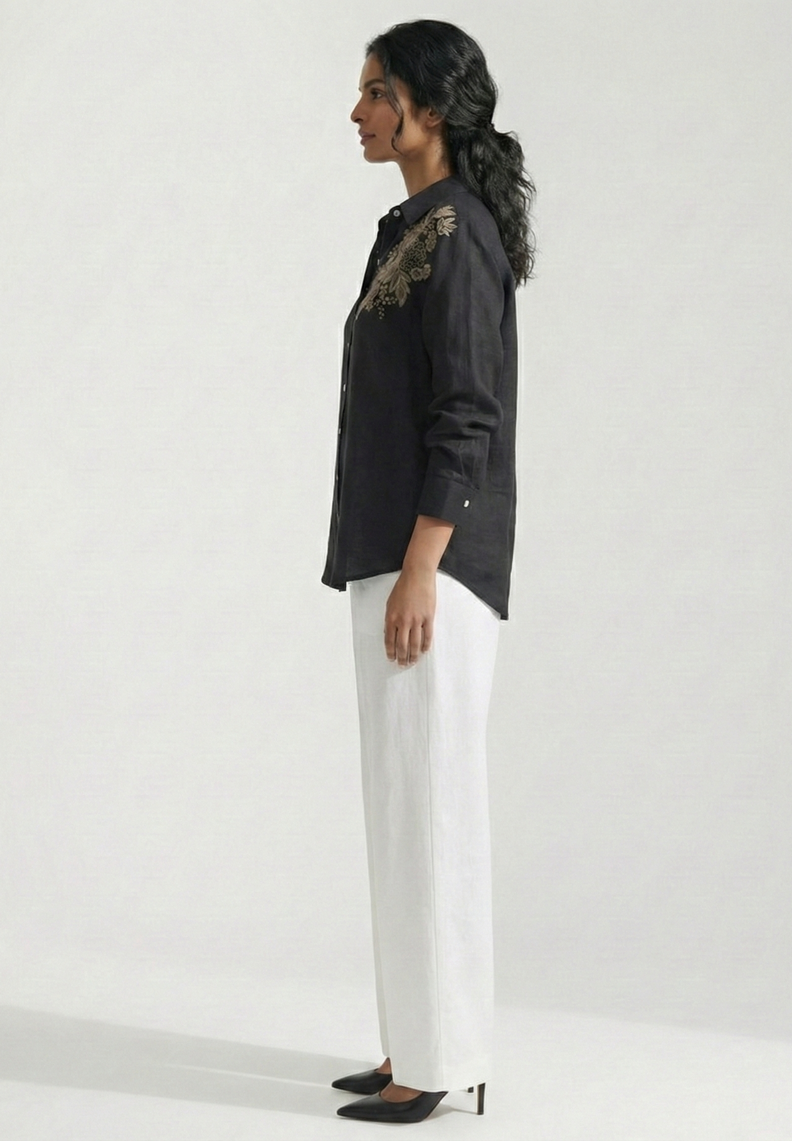 Drama meets elegance. This pure cotton linen shirt features a lavish cluster of silver floral embroidery cascading over one shoulder against a sleek black canvas. Asymmetrical, bold, and beautifully crafted - a standout piece for those who love to make an entrance.